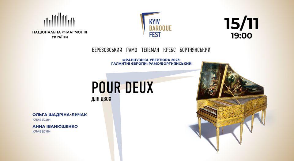15 листопада у концерті клавесинної музики POUR DEUX / Для двох за участю Ольги Шадріної-Личак та Анни Іванюшенко прозвучать твори Максима Березовського, Жана-Філіпа Рамо, Георга Філіпа Телемана, Йогана Людвіга Кребса, Дмитра Бортнянського.