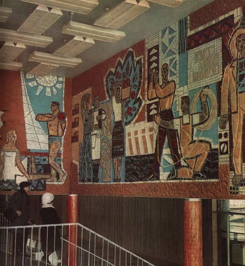 Інтер’єр був оздоблений чотирма мозаїчними панно від метрів української монументалістики: Валерія Ламаха, Ернеста Коткова та Івана Литовченка.