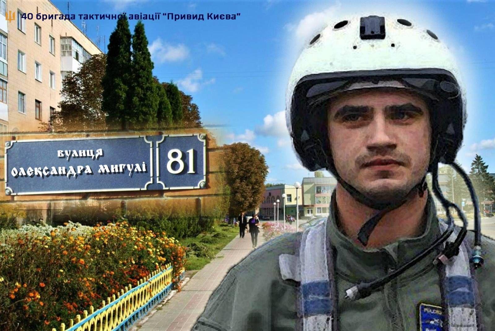 У місті Мена на Чернігівщині одну з головних вулиць назвали на честь видатного льотчика, одного з легендарних «Привидів Києва», майора 40 бригади тактичної авіації Олександра Мигулі. Він загинув 12 серпня 2024 року на Донеччині під час виконання бойового завдання і протистояння ворожим силам, нагадали у 40 бригаді тактичної авіації “Привид Києва”.