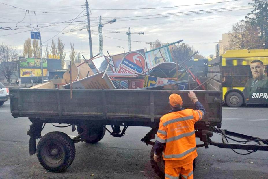 Дорожные работники Соломенского района убрали с улиц десятки незаконных рекламных конструкций.