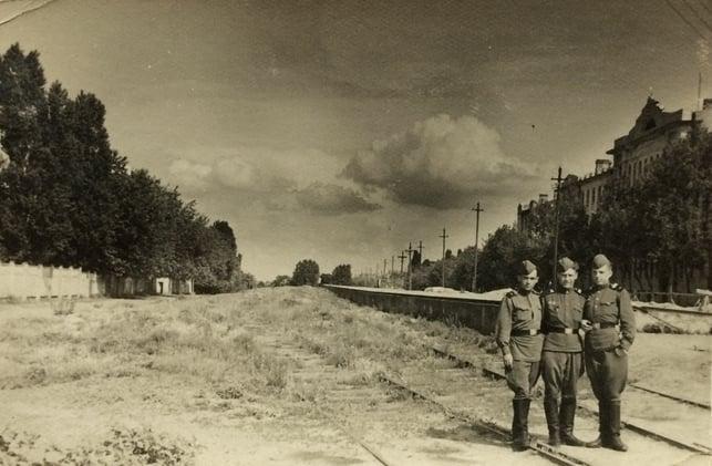 Зазначається, що світлина зроблена у липні 1953 року. На ній позують троє солдатів, видні будинки та колії.