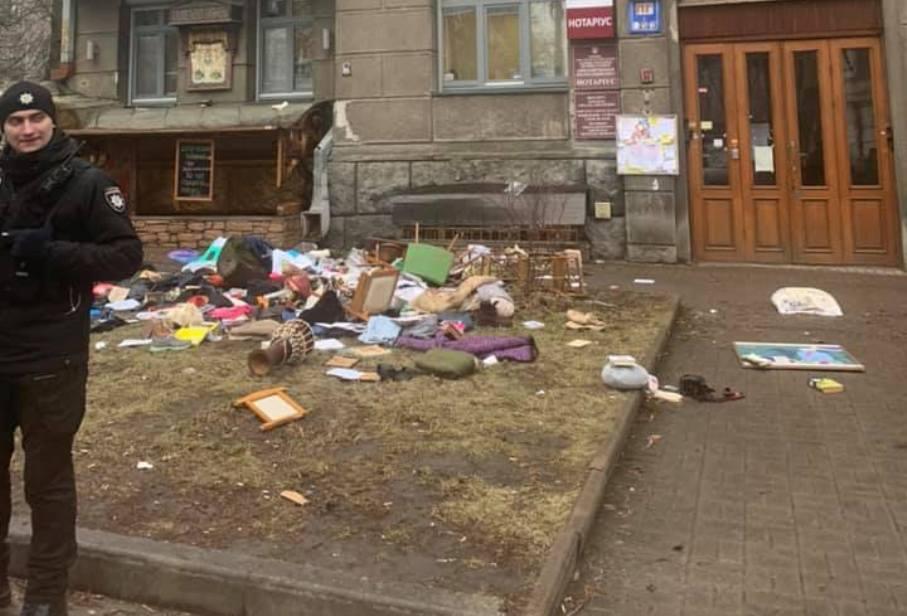 Жители столицы, которые прогуливались вчера в центре Киева, могли видеть необычную картину – на земле возле дома по улице Институтской лежала гора вещей – одежда, обувь, полки и др. Как оказалось, таким образом брошенная девушка отомстила своему бывшему возлюбленному, выбросив его вещи из окна квартиры.