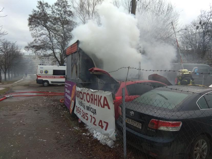 Як розповіли у ДСНС, пожежа виникла в приміщенні охорони автостоянки, з подальшим розповсюдженням вогню на поруч припаркований автомобіль.
