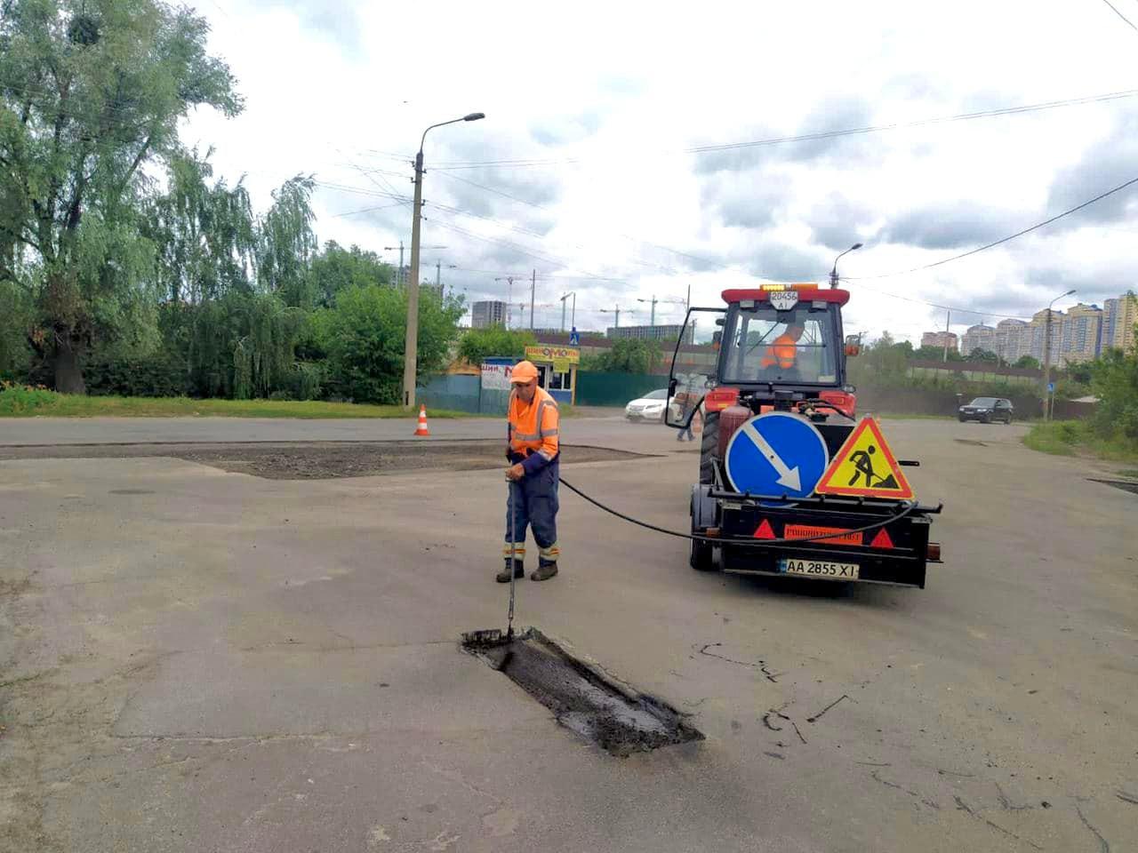 Сьогодні на вулиці Тепловозній в Києві триває поточний ремонт асфальтного покриття.