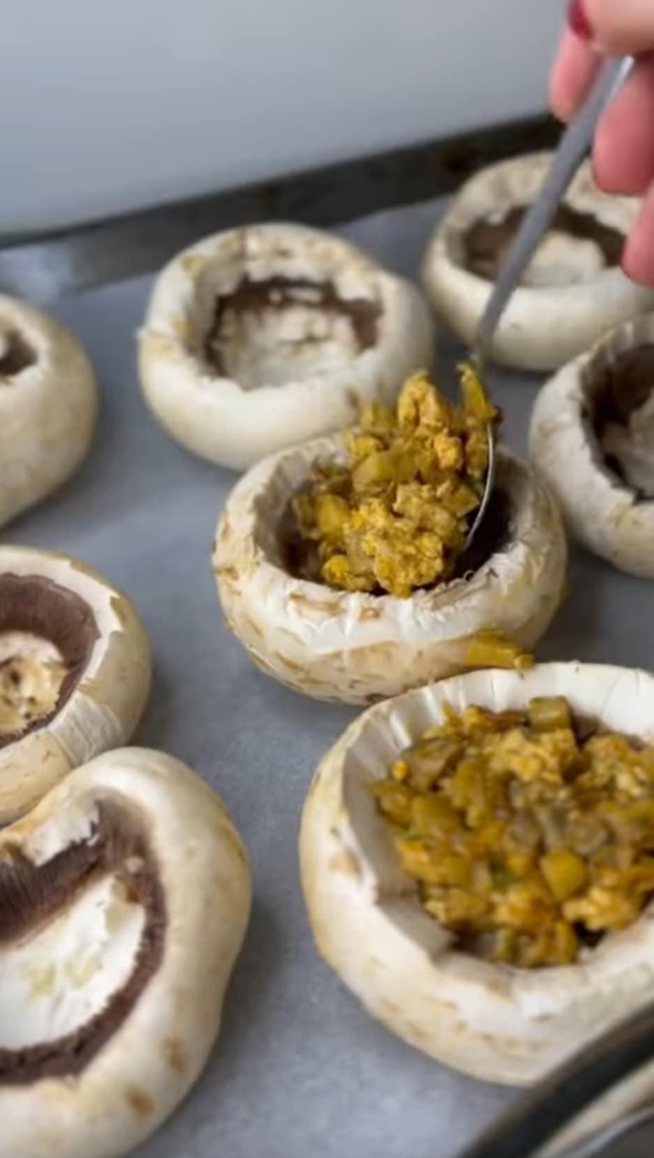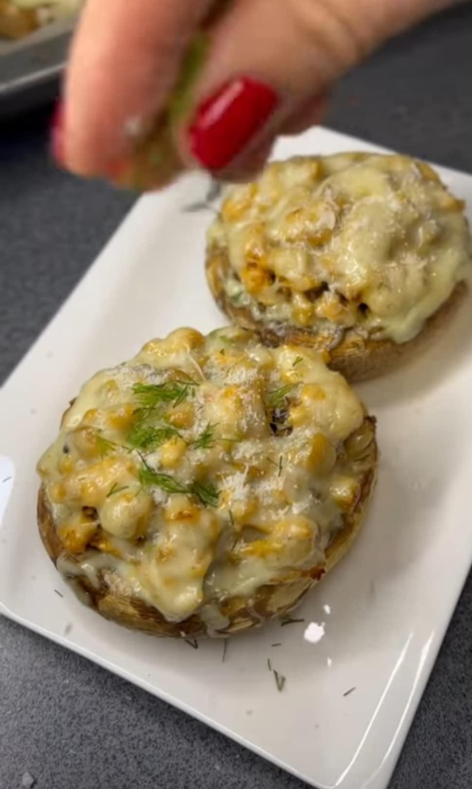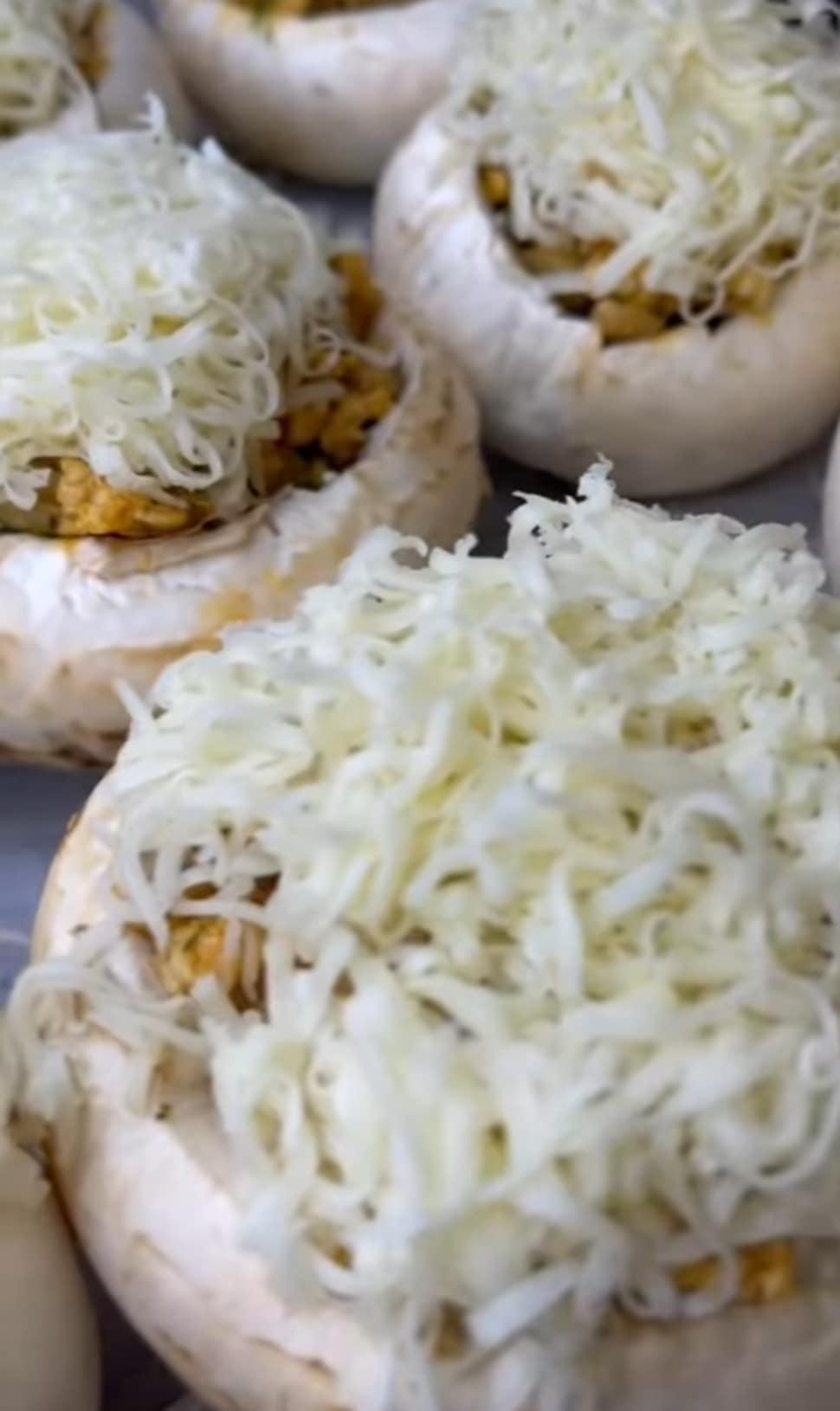 Викладіть начинку у шапки грибів, притрусіть тертим сиром та поставте випікати у духовку при температурі 180 градусів на пів години.