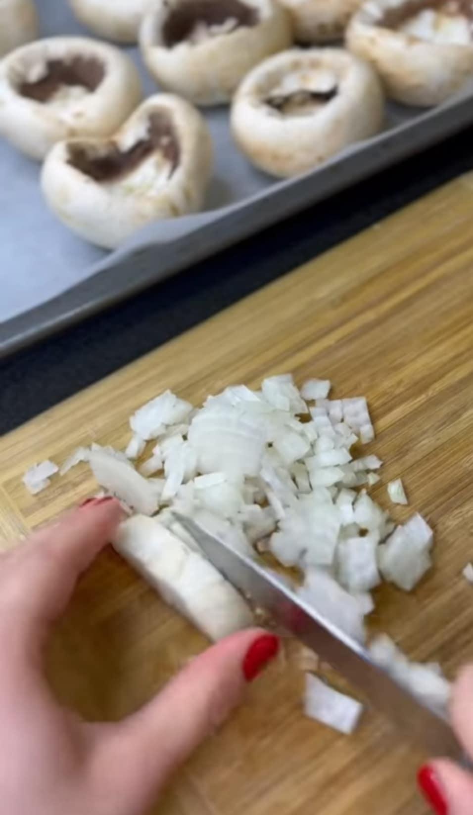 Подрібніть ніжки печериць, курку та цибулю та дошці.