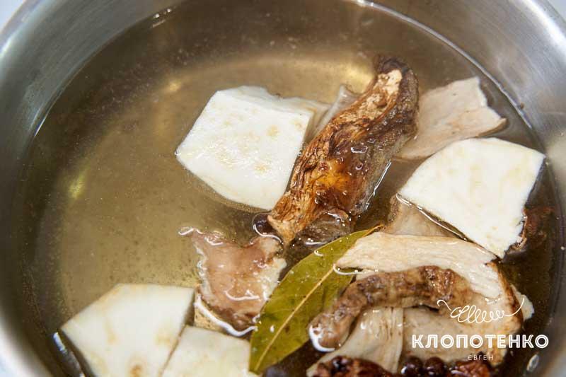 Наріжте 50 г кореня селери великими кубиками. Наберіть в сотейник 1 л води, додайте 10 г сушених білих грибів, селеру, лавровий лист і 3 горошини духмяного перцю, посоліть до смаку. Доведіть до кипіння, потім варіть на невеликому вогні 15 хвилин.