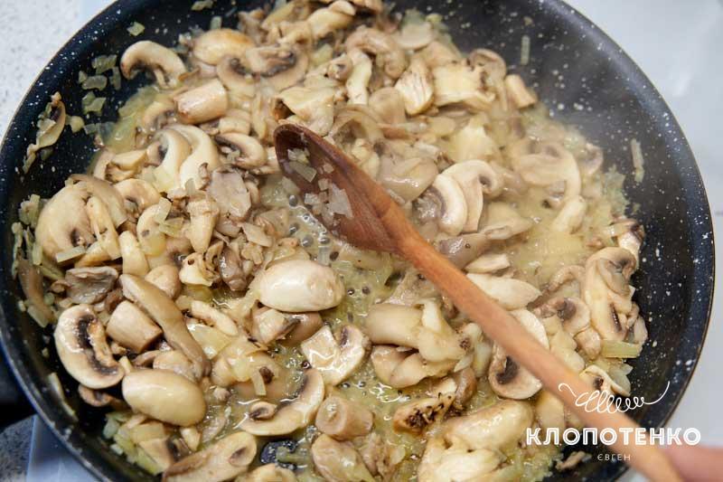Викладіть до цибулі на пательню гриби і додайте солі до смаку. Тушкуйте на середньому вогні, поки гриби не стануть м'якими, приблизно 7 хвилин.