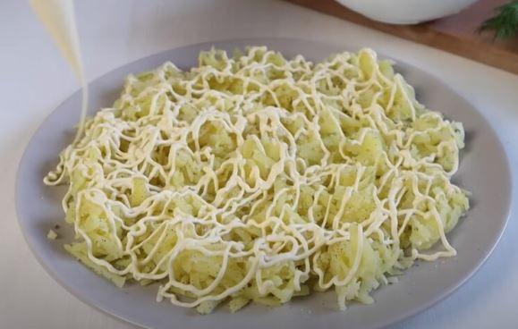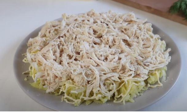 Для початку замаринуйте цибулю. Нарізайте 1 середню цибулину півкільцями і перекладіть у невелику ємність. Туди ж додайте цукор, сіль, оцет і холодну воду. Залишіть маринуватися на 1-1,5 години. Підготуйте всі інгредієнти. Картоплю відваріть в мундирі. Куряче філе відваріть у підсоленій воді. Залиште курку охолоджуватися у бульйоні, тоді вона буде більш соковитою. Яйця зваріть вкруту. Викладайте шарами салат. Підготуйте велику, плоску тарілку. Першим шаром викладайте натерту картоплю на крупну тертку. Соліть і перчіть за смаком. Картолю змастіть щедрим шаром майонезу.