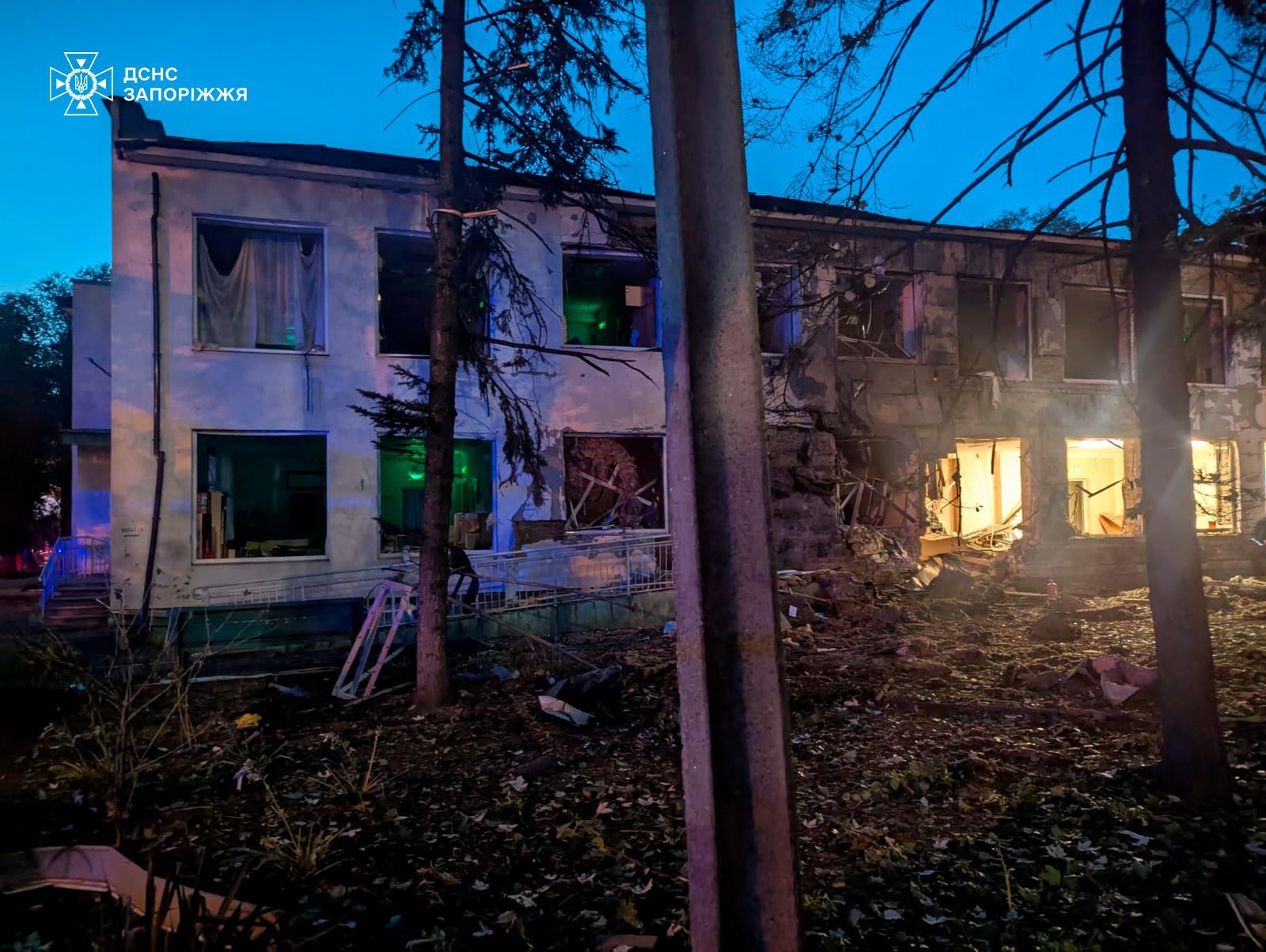 Рятувальники додали фото зруйнованого садочка. За їхніми словами у будівлі виникла пожежа площею 80 кв. м. Уламками пошкоджено сусідні споруди. На місці працюють усі екстрені служби.