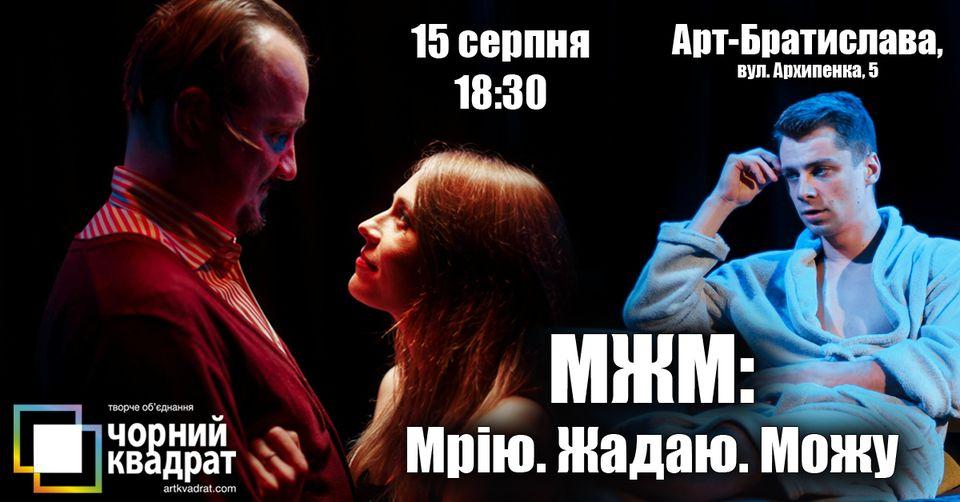 Вистава “МЖМ: Мрію. Жадаю. Можу” про хлопця, який несподівано побачив драбину з прірви френдзони. І про дівчину, яка щиро вірила у справжню дружбу без сексу між чоловіком та жінкою. І ще про одного хлопця, який починає розуміти, що таке справжній життєвий успіх. І всі ці особи сходяться в одному готельному номері, щоб подарувати один одному справжній МЖМ…