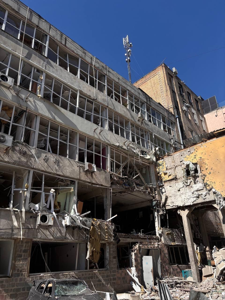 Вибухова хвиля та уламки суттєво зруйнували фасад будівлі: вибито всі вікна, пошкоджено перекриття, обвалилася частина стін, є руйнування всередині приміщень складу та кабінету.