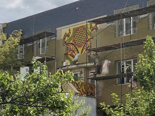 За словами активістки, майоліку на фасаді дитсадка зашивають і зараз почали заходити на панно із квіткою Нарбута.