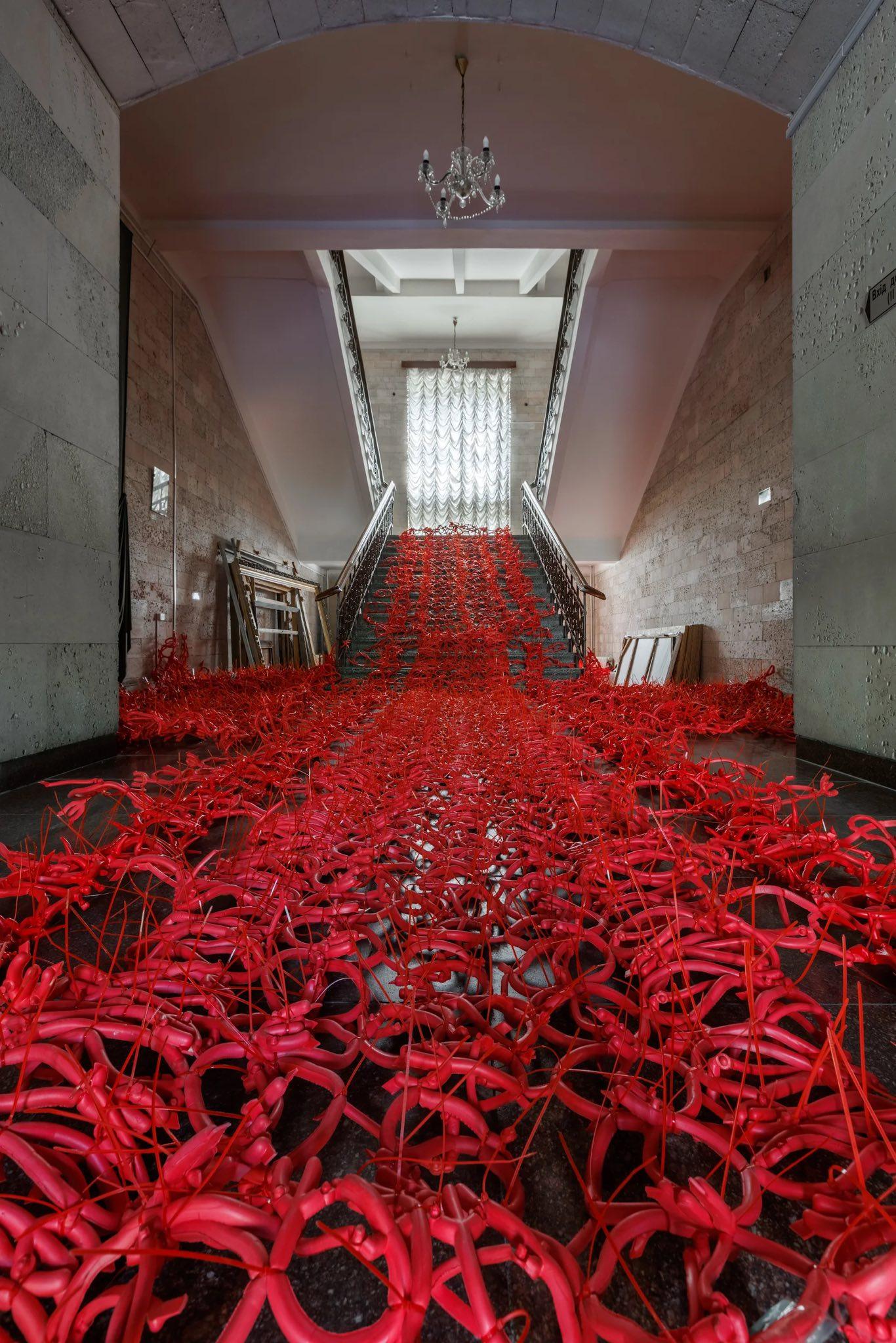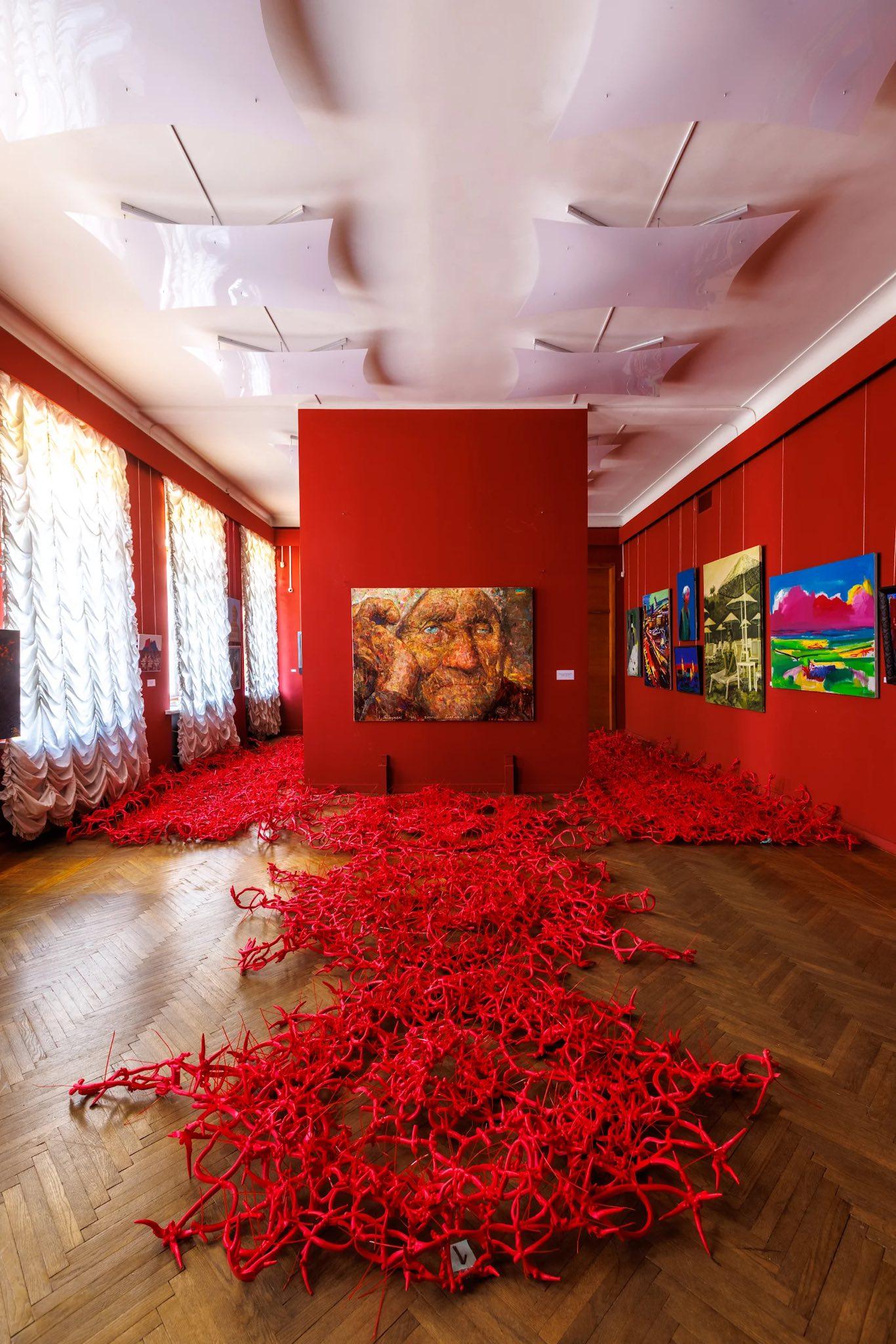 “Робота перетворюється на живу артерію, що обвиває сходи та стіни, звертаючись до тем війни, пам’яті, крові та втрат”, — написав Валерій.