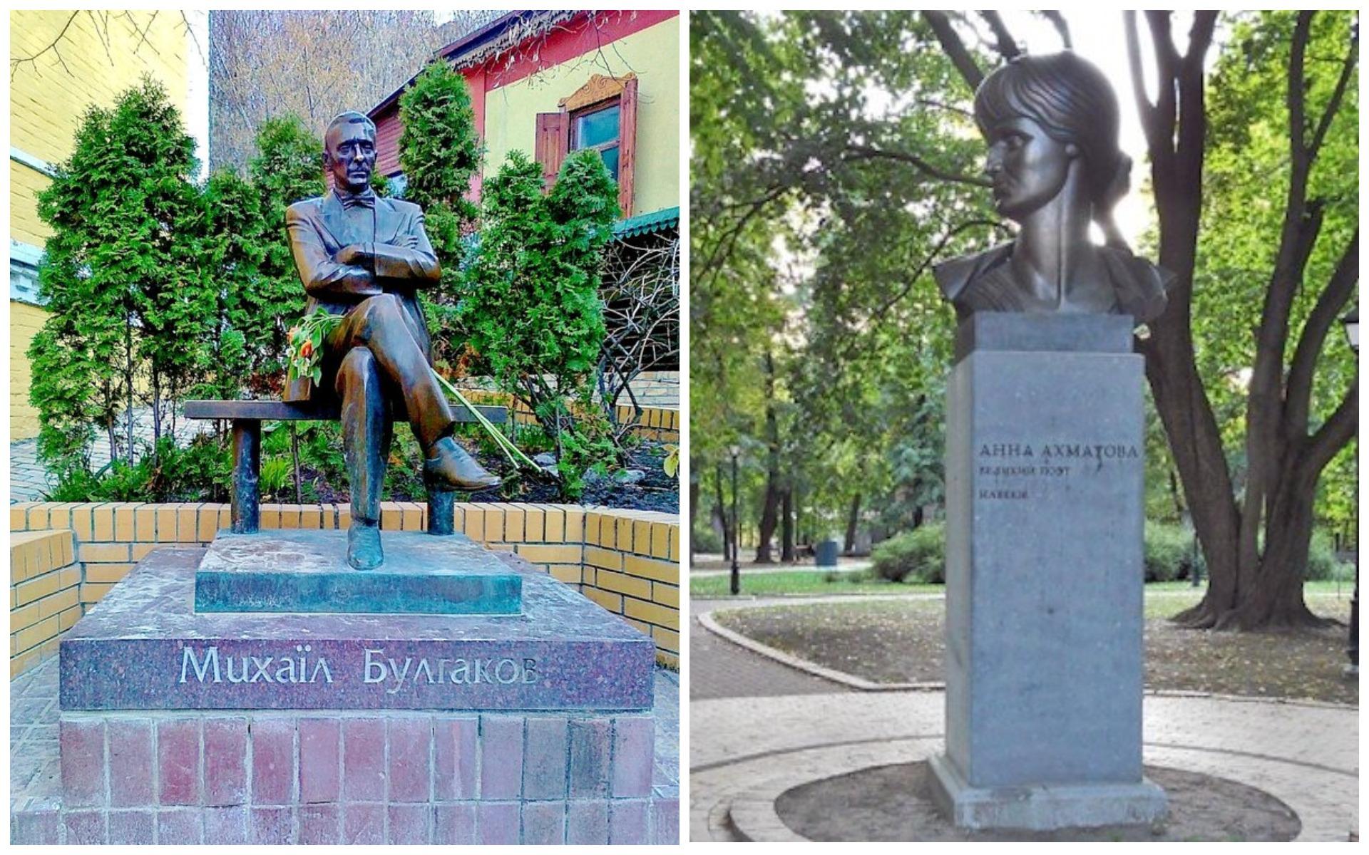- пам’ятники Дмитру Мануїльському; Михайлу Глінці, Анні Ахматовій та Михайлу Булгакову,
