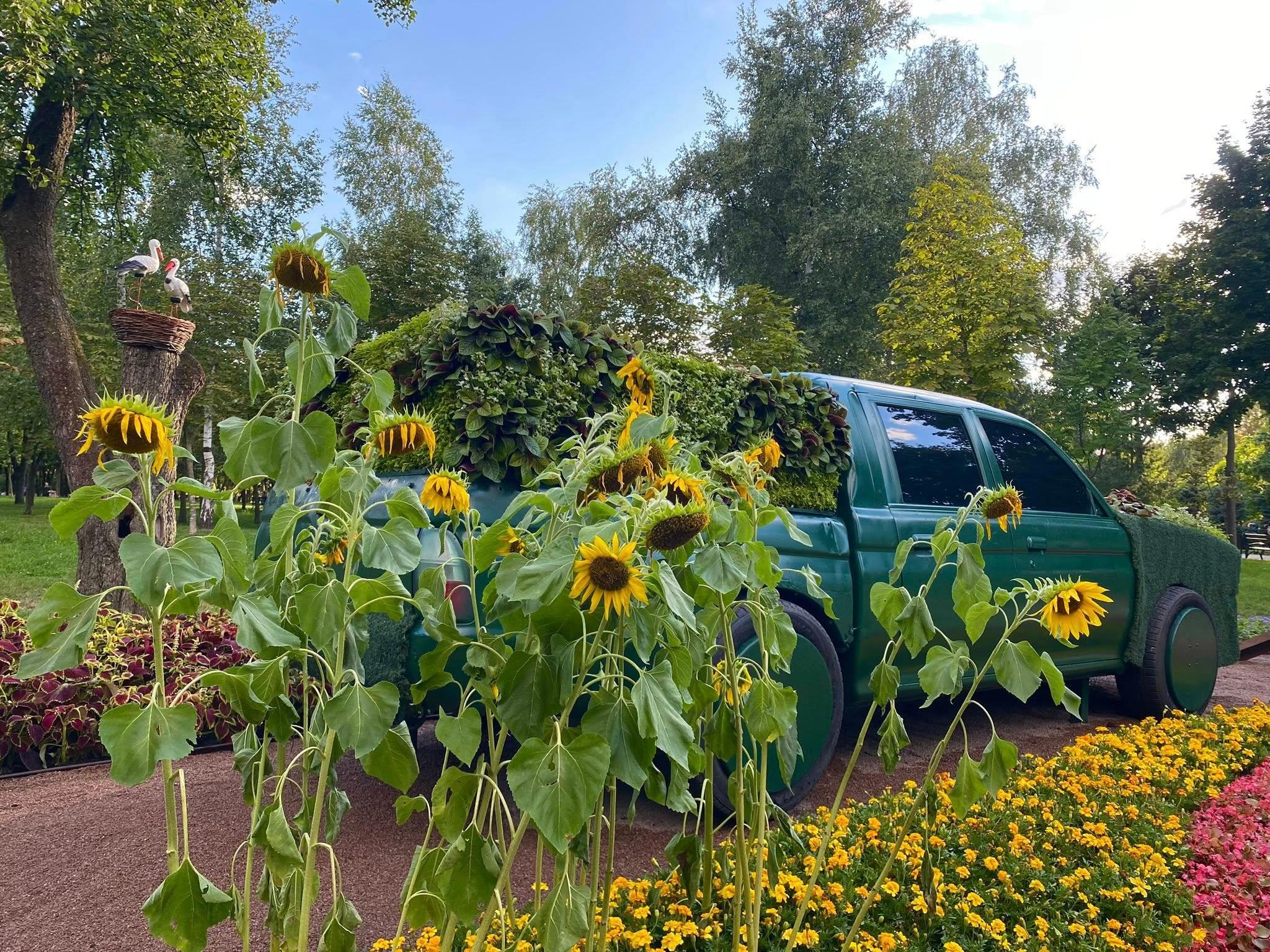 У центрі розташований волонтерський автомобіль, який має особливу історію: волонтери з’єднали та відновили два понівечені на війні автомобілі, подарувавши їм нове життя. А з їхніх уламків народився цей «зелений» символ стійкості й відродження.