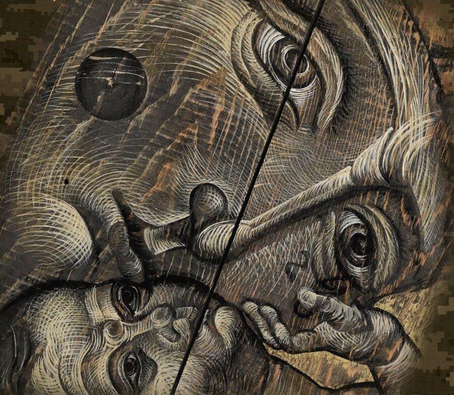 У центрі експозиції – військові ікони Сергія Герасименка (позивний Художник) – воїна й майстра, що пише святі образи на уламках війни: дошках, які пережили обстріли, та фрагментах снарядів С-300, що «не долетіли» до місця його дислокації. Сергій Герасименко — художник-монументаліст, іконописець, учасник бойових дій, що з першого дня повномасштабної війни став до лав ТРО Києва.