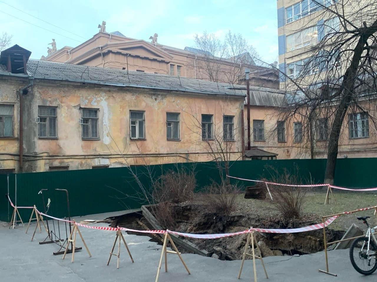 Він разом з архітекторами роздивлявся вирву, що утворилася в дворі між будівлями 8а та 8б, що в Музейному провулку: це місце, де 8 березня пішло під землю одразу три припарковані автівки. Після того як автівки прибрали, а завал трохи розчистили – зʼявилась можливість його оглянути краще.