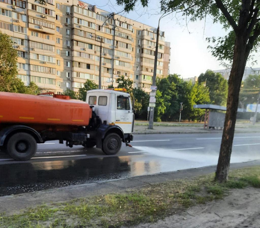Полив вулиць дає змогу зменшити кількість пилу, а також охолодити покриття для зменшення деформацій у спеку. Сьогодні вранці на міських вулицях уже працювало 18 спецмашин.